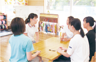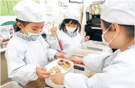 子どもたちと一緒に楽しく給食を食べます。机の用意や配膳の手伝いなどもします。