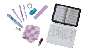 持ち物を見せてください。 好きな色の紫・青系で揃えた文房具類とiPad。iPadは授業のスライドを見たり課題のレポート作成に使ったりするだけでなく、楽譜としても大活躍!今日は持っていませんが、弾き歌いの楽譜や折り紙などもよく持ち歩いています。