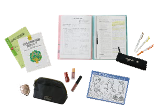 持ち物を見せてください。 今日の持ち物は教科書や筆記具の他に実習で使う絵本や自作のペープサートなど。メイク直しのためにコスメポーチはいつでも必携です!