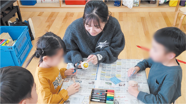 それぞれの成長や発達について学んだうえで、その年齢に合ったおもちゃを制作。つくったおもちゃで子どもたちと一緒に遊び、反応を確かめながら学びを深めます。