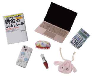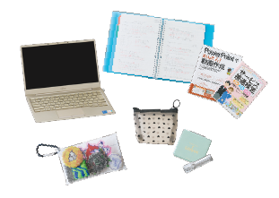 持ち物紹介 入学時から愛用しているノートPCは授業や課題で大活躍!電卓は高校の時から使い続けているものです。メイク用品は身だしなみを整えるだけでなく気分転換にもなるお気に入りのものを持ち歩いています。