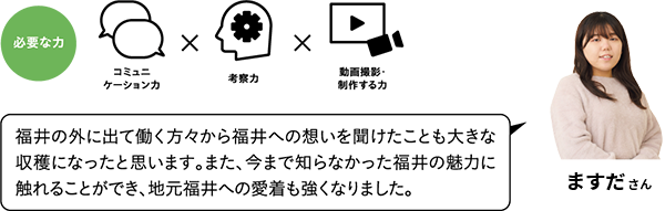 県外で活躍する福井の企業を通して福井の魅力を再発見する活動です。今年度は増田さんをはじめ3人の学生が参加し「福井新聞社東京支社」「オールコネクト東京支店」「ふくいアンテナショップ291」を取材。その内容を動画にして配信しました。