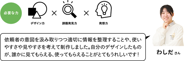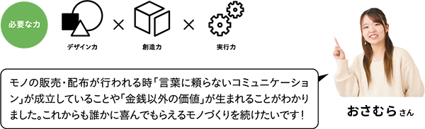 学んだこと、成長したと思うことを教えてください デザインを基礎からしっかり学べるのはもちろん、自治体や企業からの依頼をもとにデザインに取り組むなど実践的な課題に挑戦でき、スキルを高めながら、デザインやものづくりの楽しさを再認識できました。また、デザインだけでなくビジネスなど学びの領域が幅広いので、将来の選択肢を増やせることが大きな魅力のひとつだと思います。私はデザインを仕事にするのではなく、事務の仕事をしながら自由にデザインを続けるという道を見つけることができました。自分らしい「デザインとのかかわり方」を見つけることができたのは、この幅広い学びのおかげだと思います!
