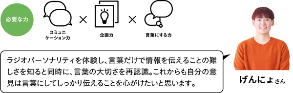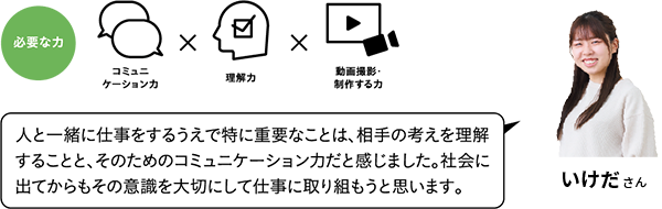 学んだこと、成長したと思うことを教えてください 2年間という短い期間ですが、ビジネスソフトの使い方やマナーなど、入学前に目的としていた力はしっかり身についたと思います。さらに、動画制作の授業や他の大学の学生と協力して取り組んだラジオ番組の制作を通じて「受け取る側を意識する」という、情報発信やコミュニケーションの基本となる考え方も学ぶことができました。動画制作で身についたスキルと併せて適切な情報発信に役立てたいです。