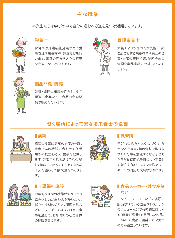 - 栄養士を中心に食に関する分野で活躍。